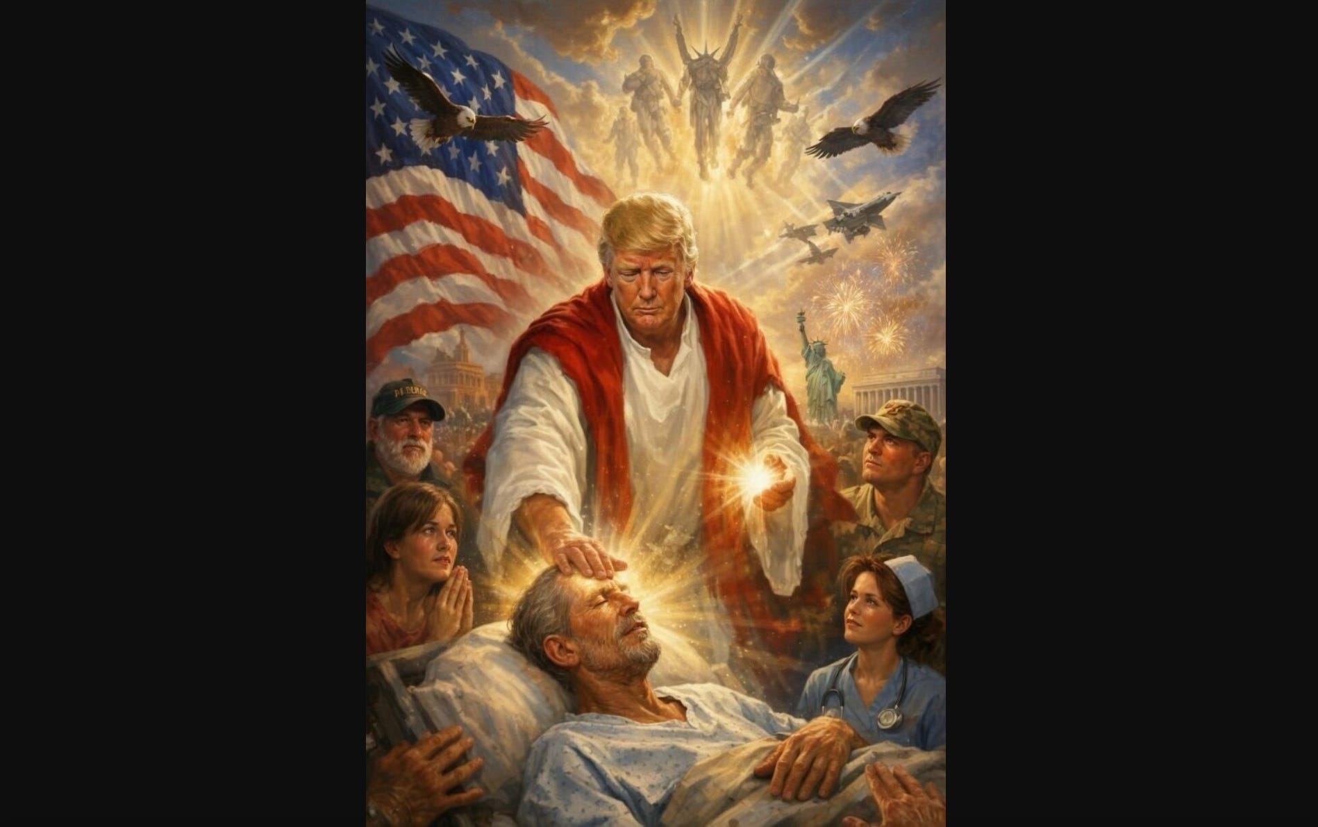 This weekend Donald Trump went on a social media tirade of religious proportions. He shared an AI slop image of himself depicted (literally) as Jesus Christ, applying a healing hand to the forehead of a man, while pious, red-blooded, presumably MAGA Americans—a soldier, a praying woman, a clinician—look on in awe. In the background eagles and fighter jets soar against fireworks, the American flag, and the Statue of Liberty.