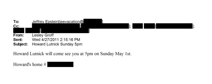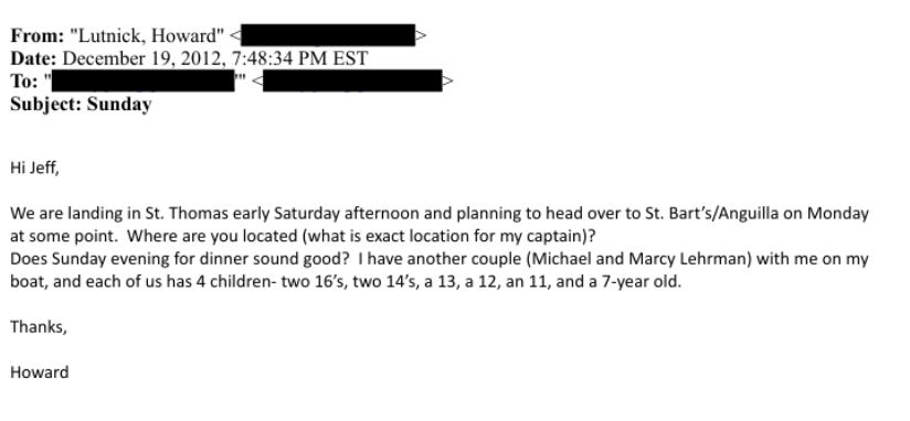 In December 2012, Lutnick reached out to Epstein to arrange a visit with his family to Epstein’s private Caribbean island. Lutnick’s wife followed-up to advise Epstein’s assistant that the Lutnicks would arrive on a 188-foot yacht named “Excellence.” And one day after the visit was scheduled to take place, Epstein’s assistant forwarded a message to Lutnick that said, “Nice seeing you.”