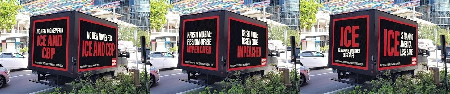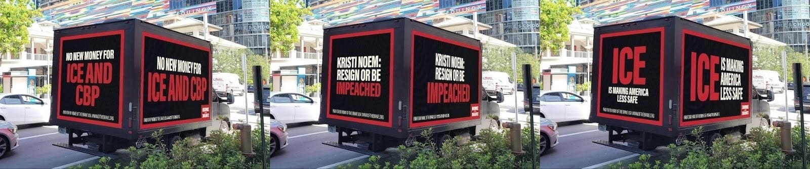 The campaign features two mobile billboard trucks circling Capitol Hill all week, showcasing the messages “ICE is making America less safe,” “Kristi Noem: resign or be impeached,” and “No new money for ICE and CBP.”