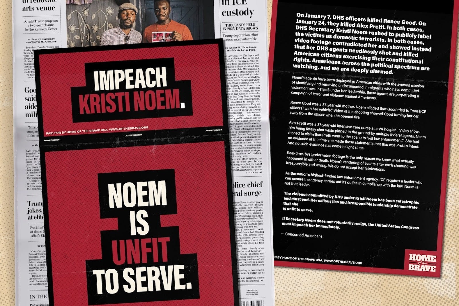 Additionally, Home of the Brave will be hand-delivering these messages straight to the offices of all members of Congress via The Washington Post. The copies of the Post delivered to Congressional offices today will feature a cover wrap and an open letter calling for Noem’s impeachment.