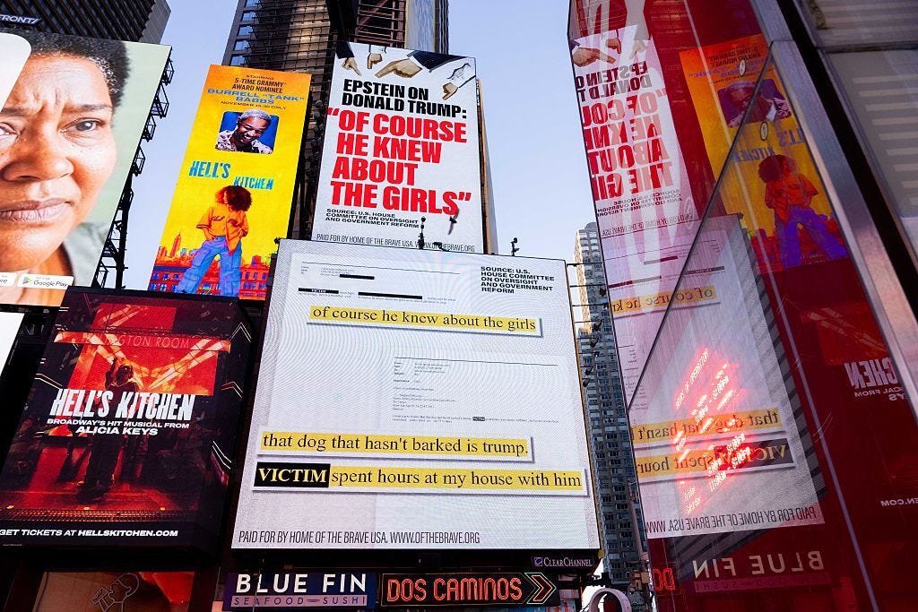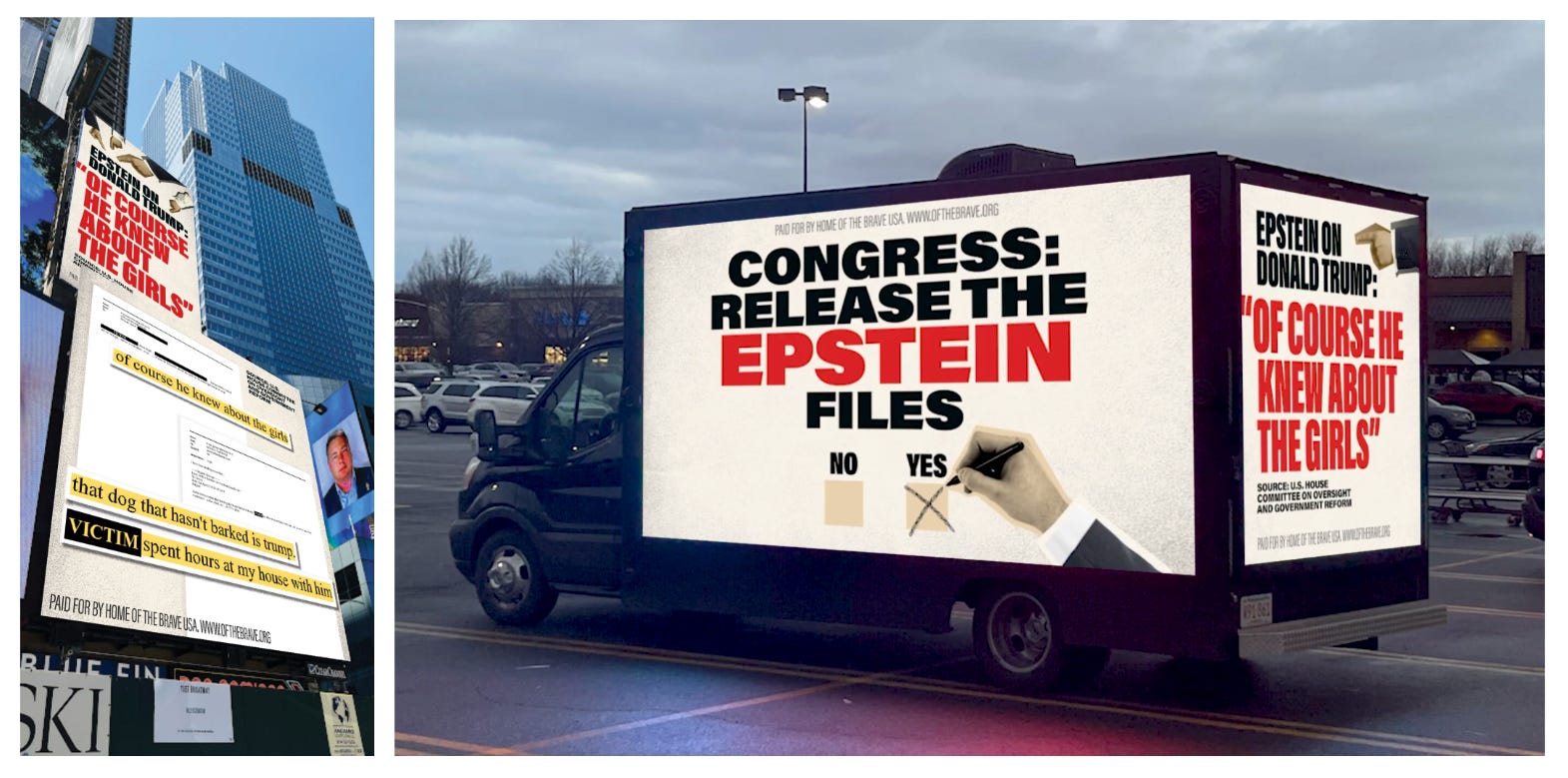 For the next two weeks, Home of the Brave is running a massive Times Square billboard featuring Epstein’s damning quote, to make sure the public doesn’t forget. And we have two billboard trucks circling Congress while members get ready to vote on the Epstein Files Transparency Act, which has already garnered support from many high-profile Republicans:
