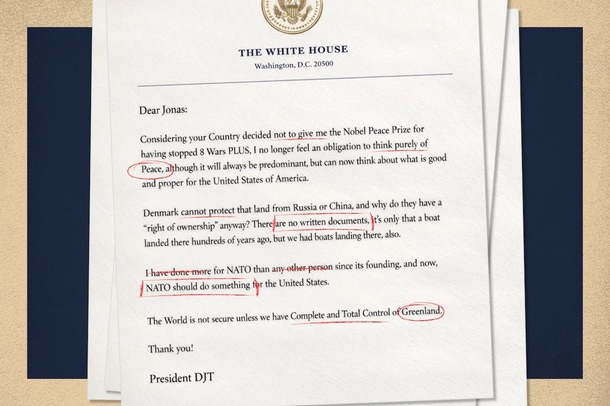 So I was not surprised when he put out a typically deranged letter, addressed to the Prime Minister of Norway, in which he threatens Greenland with military action on the basis that Norway didn’t award him the Nobel Peace Prize (Denmark, not Norway, controls Greenland). For those who haven’t yet read it, the letter is bewildering and horrifying.