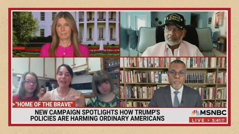 Earlier this week, Ronn, a disabled Vietnam veteran, sat across from Nicolle Wallace on MSNBC and spoke directly to America about how staffing cuts at the Department of Veterans Affairs will affect millions of veterans. Next to him was Kirsten, a mother sharing how Trump’s cuts to the NIH and Alzheimer’s research threaten the future of her young daughter Sallie, who has Down syndrome.